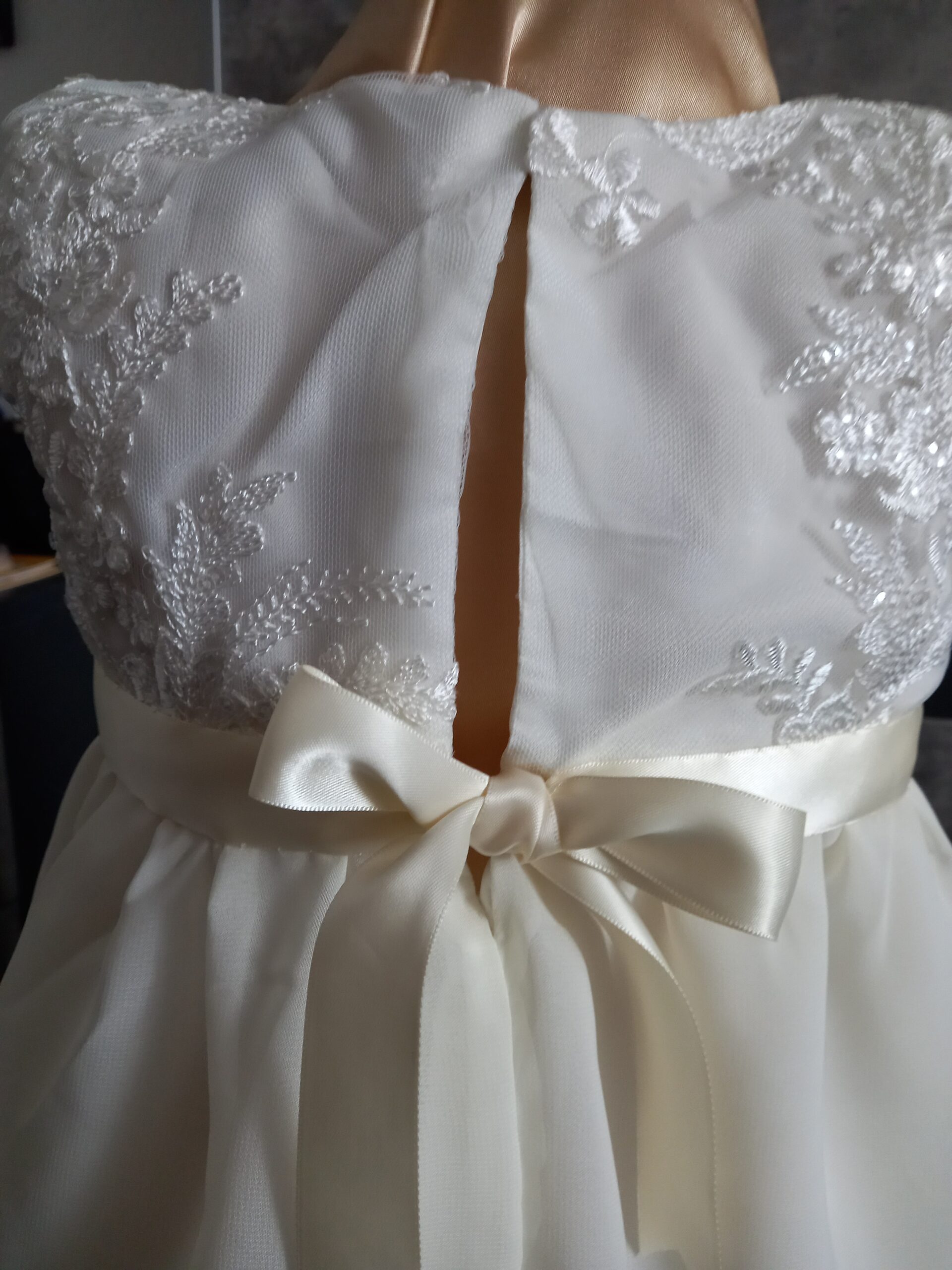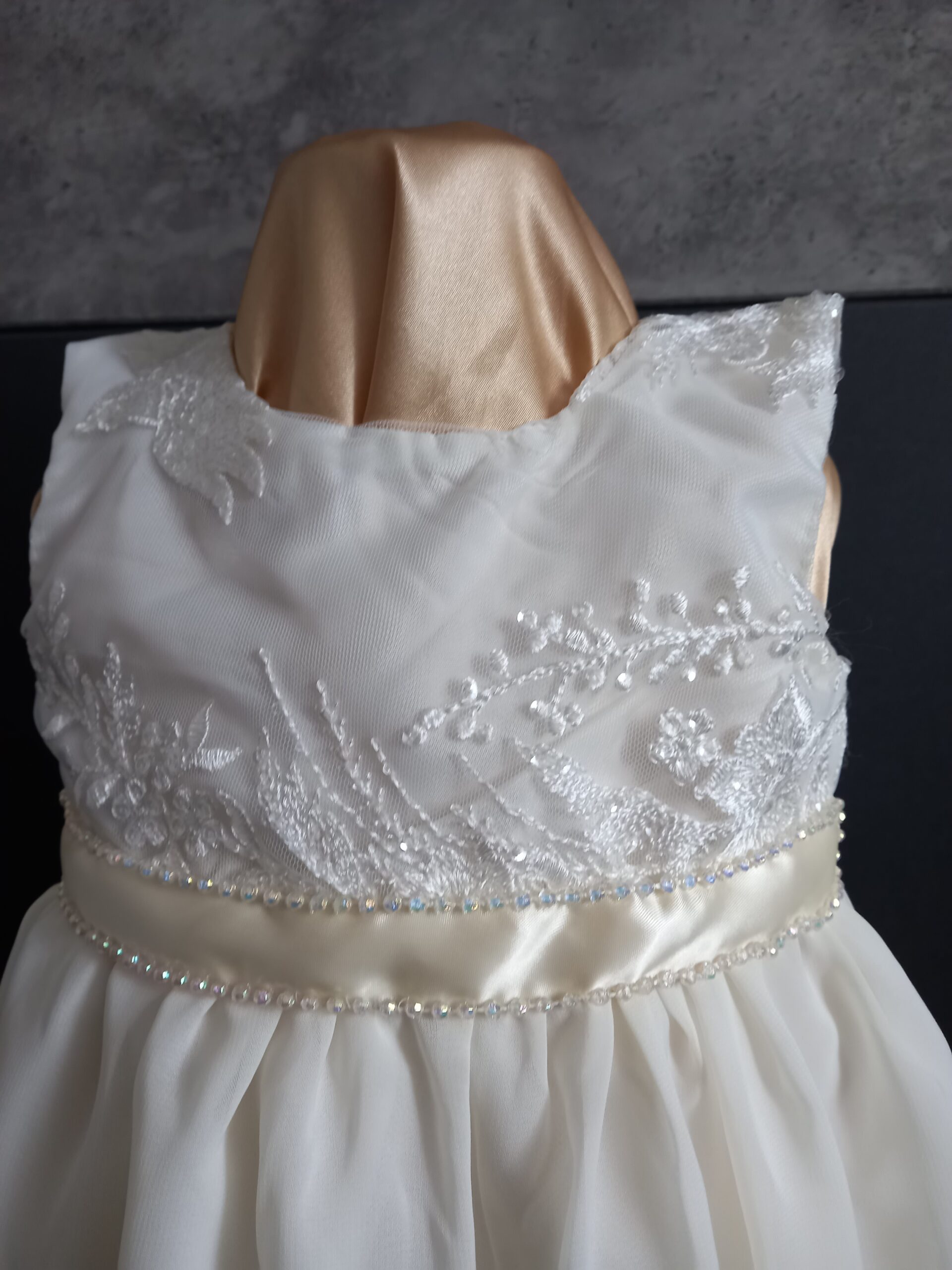 Maia is a gorgeous  sleeveless champagne dress, with a three layer tulle underskirt, covered with a soft chiffon. Bodice is soft chiffon with beaded lace, showing birds of paradise, ribbon sash with hand sewn beading, back fastening is small delicate frog fasteners in matching champagne colour. Made to order, sizes 6 months to 8 years old.