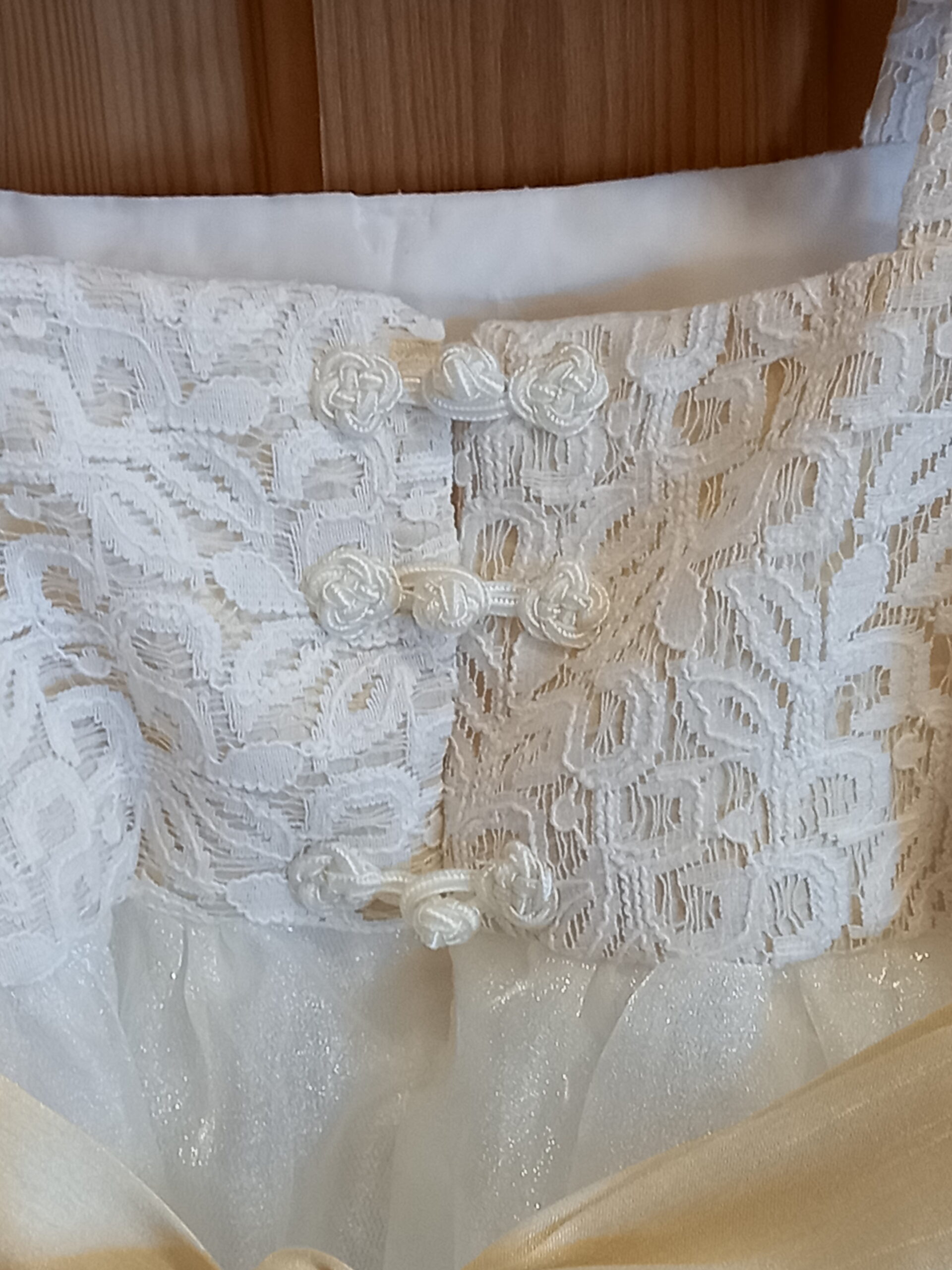 Champagne taffeta skirt with 2 layers of tulle underskirts and ivory lining. Bodice in champagne lace and ivory brocade, champagne ties and tulle butterfly. Fastenings are champagne coloured frog fastenings, but can be closed with a zip of different fastenings, this dress can be in various colours of your choice.