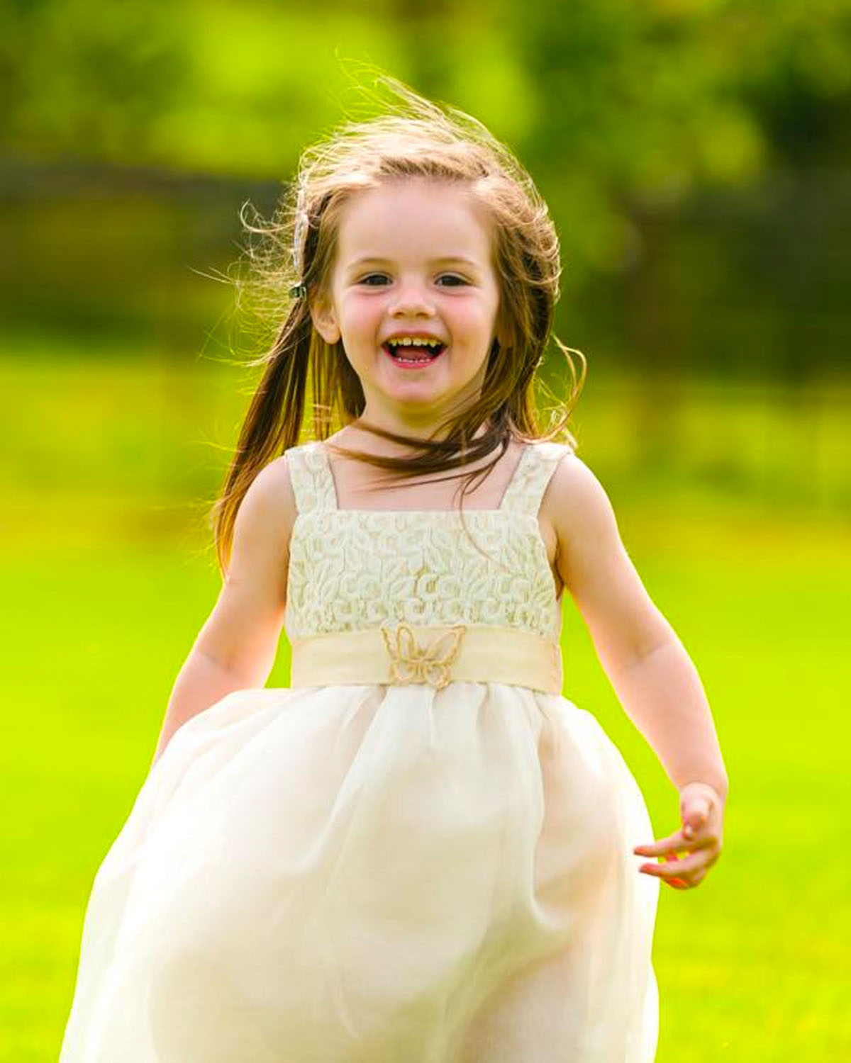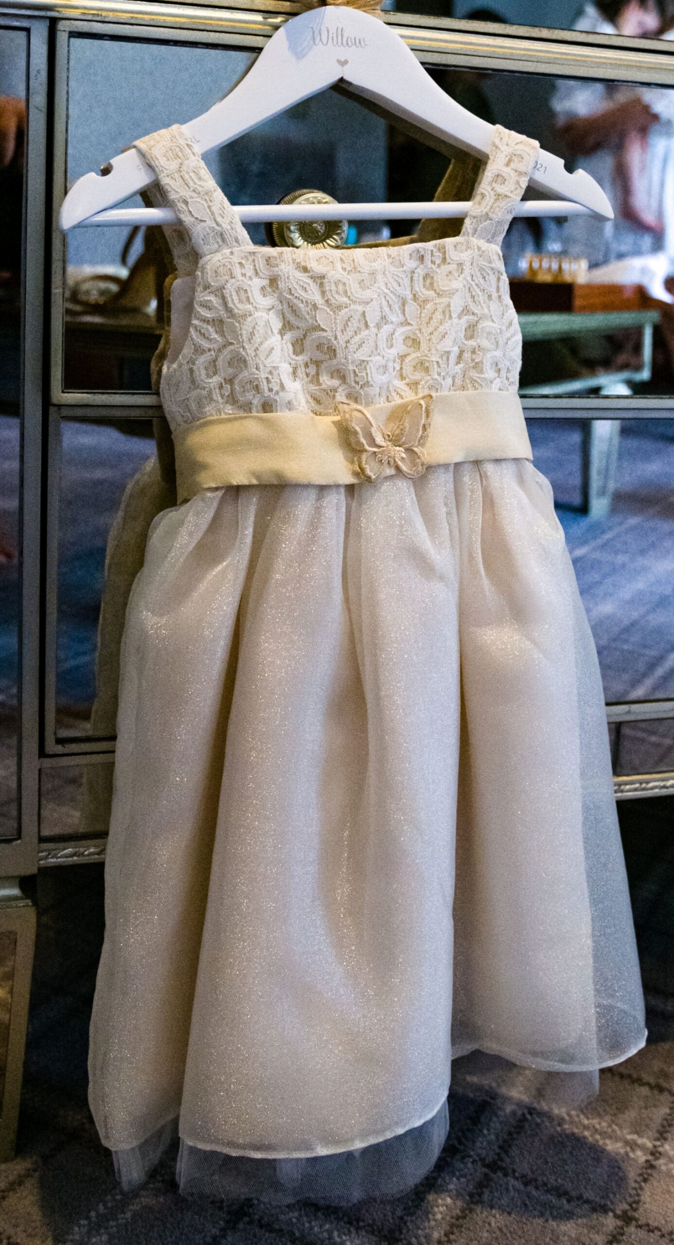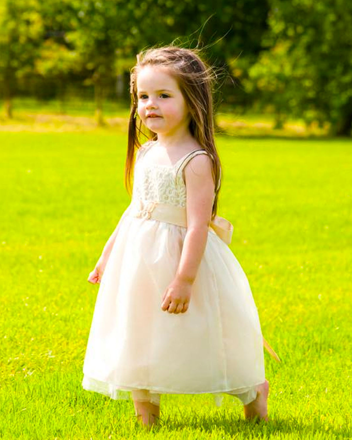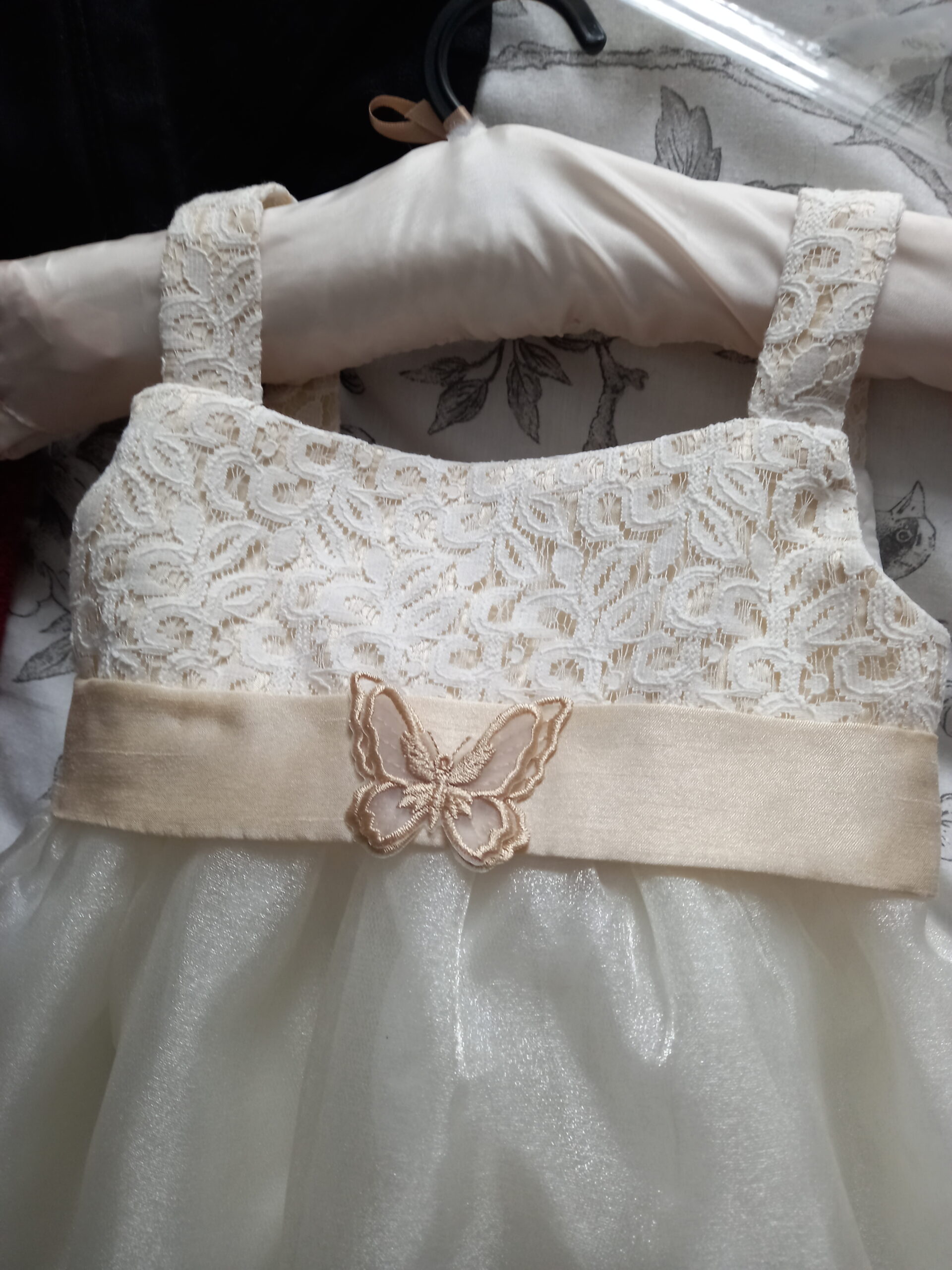 Champagne taffeta skirt with 2 layers of tulle underskirts and ivory lining. Bodice in champagne lace and ivory brocade, champagne ties and tulle butterfly. Fastenings are champagne coloured frog fastenings. We can do various fabrics and colour choices for this dress, please ring or email for more information. Sizes are from 6 months to 8 years.