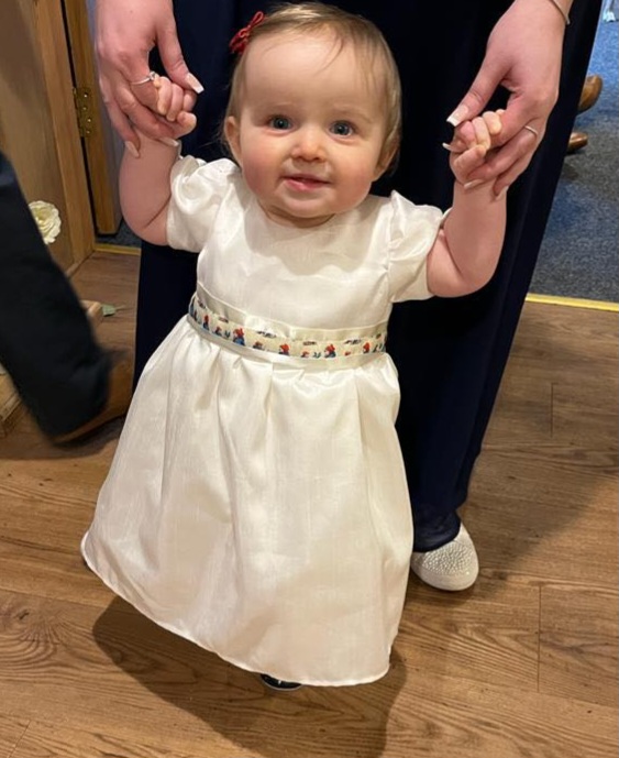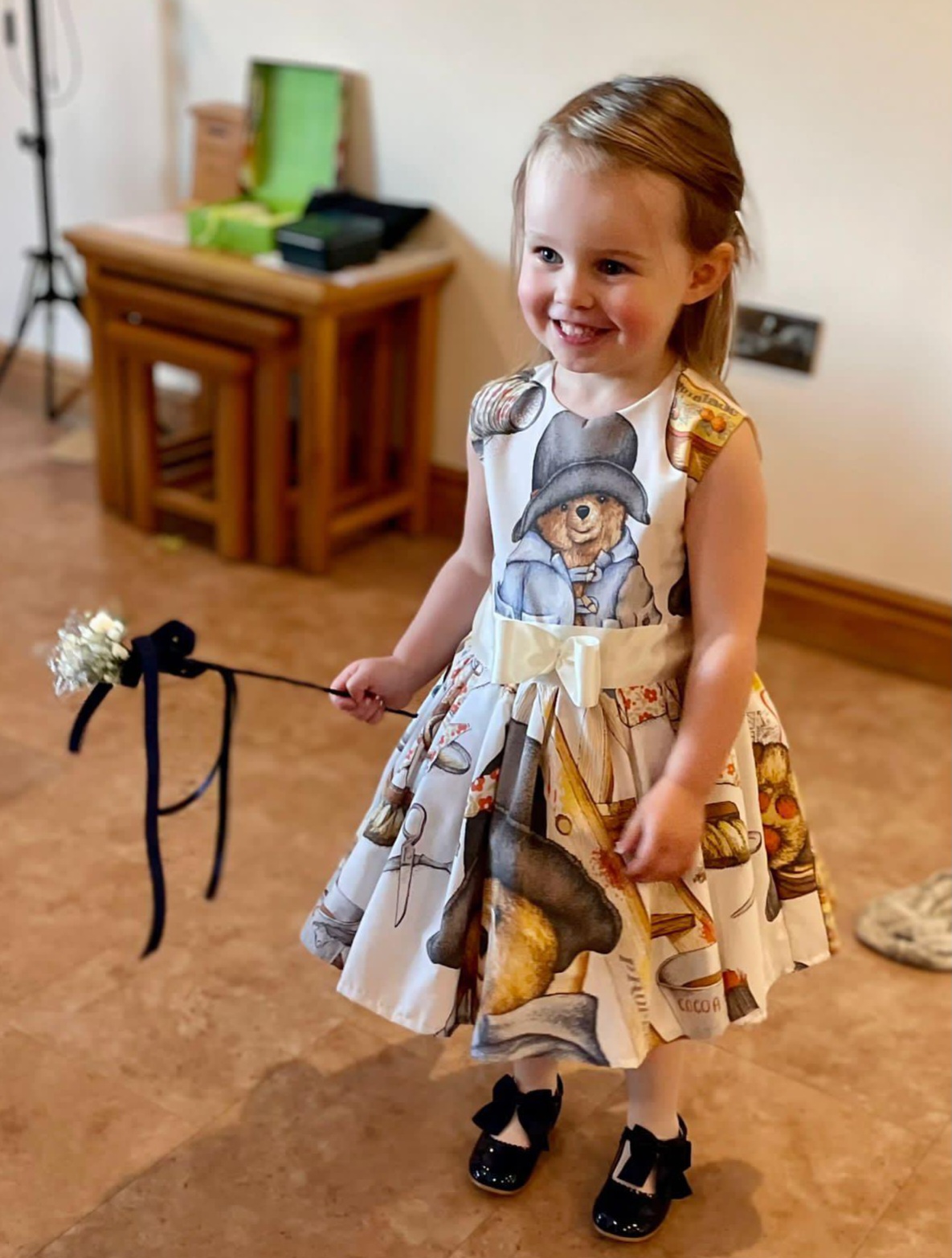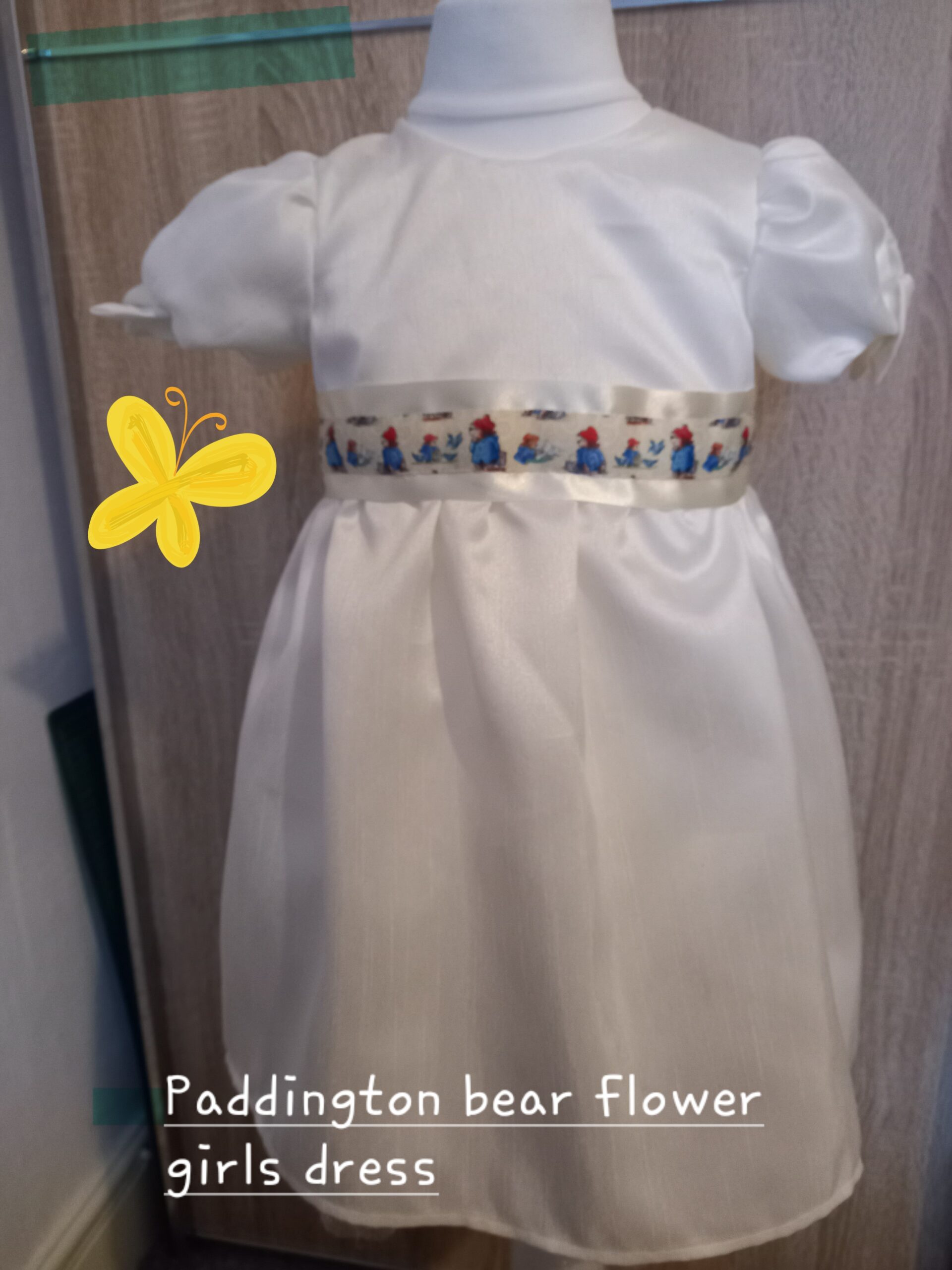 Character dresses, for those who have a theme to their wedding, we strive to make sure that we can adapt to work with your theme. Here is one we did for a lovely lady, who’s wedding theme was Paddington Bear. So we adapted a dress for her eldest flower girl and did a plain dress in ivory satin with a grosgrain sash with paddington on it.